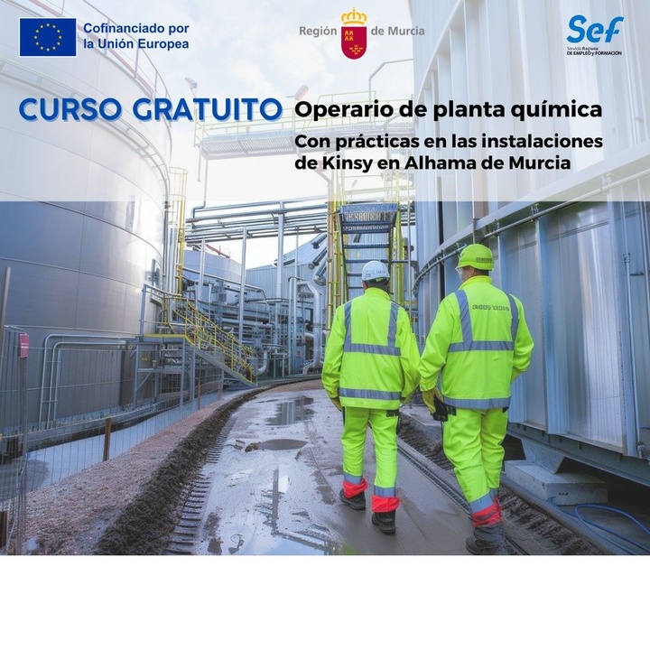 El Servicio Regional de Empleo y Formación (SEF), dependiente de la Consejería de Empresa, Empleo y Economía Social, ha abierto el plazo de inscripción de un curso gratuito de operaciones básicas en planta química para 15 personas desempleadas, que incluye prácticas en las instalaciones que la compañía farmacéutica Kinsy tiene en Alhama de Murcia.