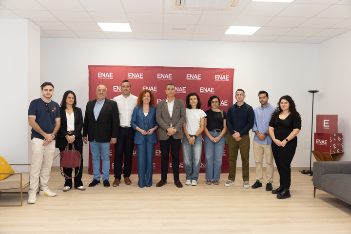 La directora general del Servicio de Empleo y Formación (SEF), junto con el director general de ENAE, Miguel López y el responsable de empleo de ENAE, Pedro López, acompañados de una representación de los becados.