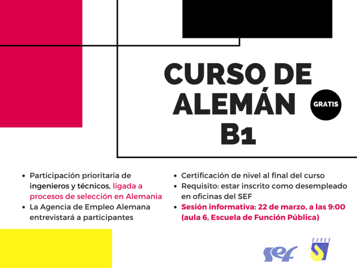 La Consejería de Desarrollo Económico, Turismo y Empleo, a través del Servicio Regional de Empleo y Formación (SEF), ha lanzado un curso de alemán gratuito de nivel B1 dirigido a personas con formación técnica y en ingeniería, que son los perfiles profesionales que actualmente demanda la Agencia de Empleo Alemana (ZAV) a la Región a través de la Red Eures.